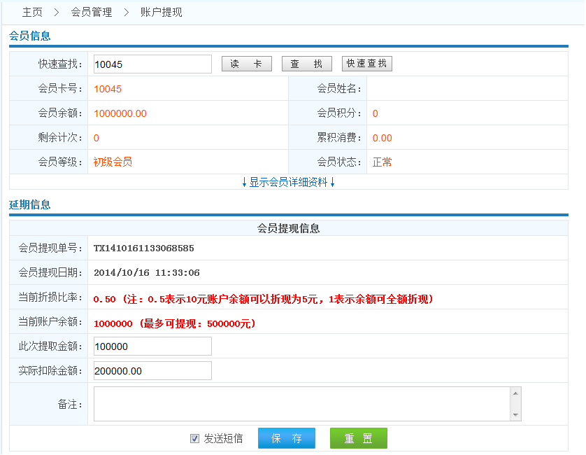 操作流程: 查找會員------>錄入提現(xiàn)金額------>保存------>密碼重置成功