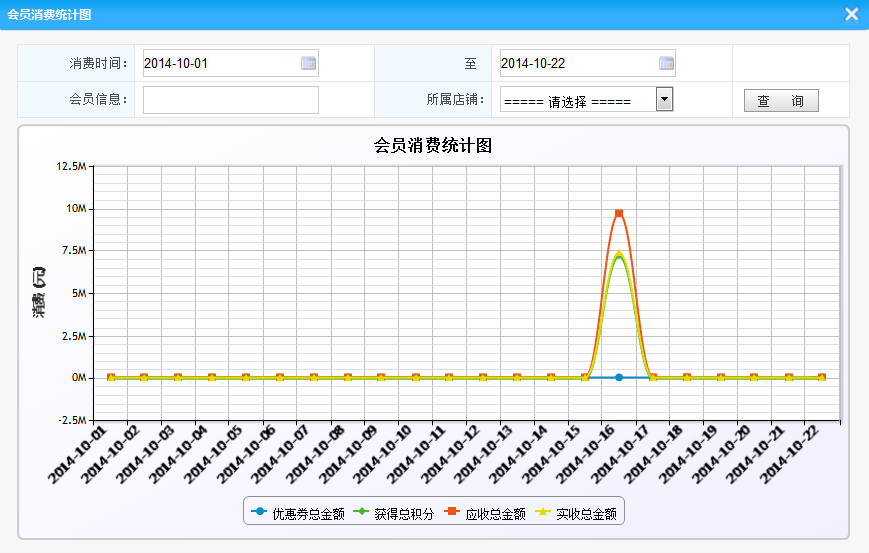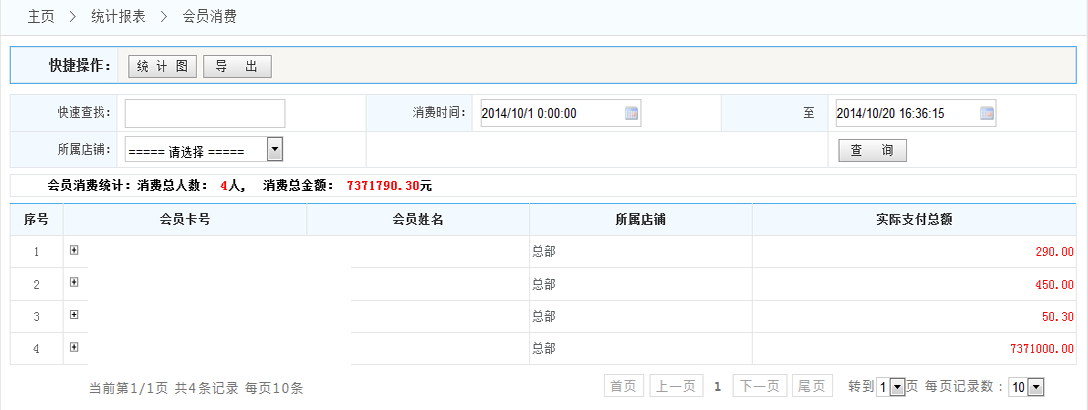 2.會員消費統(tǒng)計:將統(tǒng)計在滿足設(shè)定的條件下的所有消費的概況