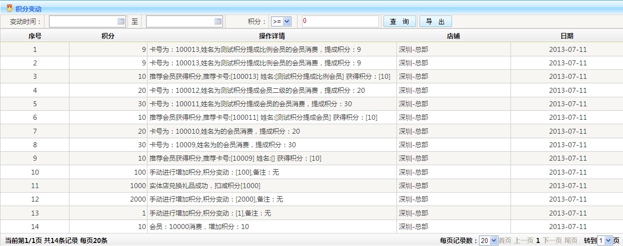 積分變動(dòng): 1.查詢:可以根據(jù)積分的數(shù)量 時(shí)間段等條件查詢 2.導(dǎo)出:可以將按條件查詢出來(lái)的數(shù)據(jù),以Excel表格形式導(dǎo)出