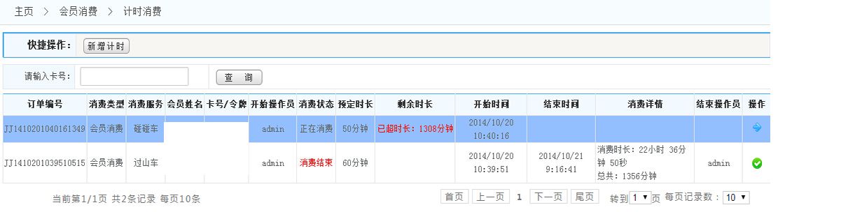 顯示:點擊菜單欄的計時消費(fèi),將進(jìn)入如下界面, 此頁面顯示的是計時消費(fèi)的詳細(xì)列表