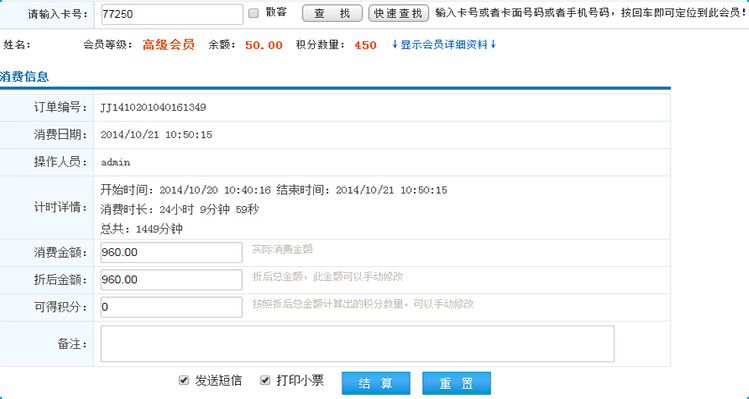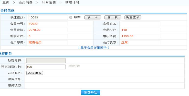 在文本框中輸入會員卡號,可查詢該會員的計時消費(fèi)記錄