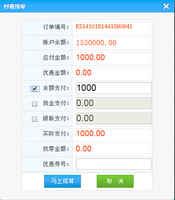 點擊結(jié)算按鈕將彈出付費(fèi)找零界面,點擊馬上結(jié)算可完成消費(fèi):