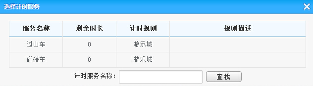 通過刷卡或者是查找定位到會員信息,點擊選擇服務(wù)按鈕將彈出計時服務(wù)列表框,從其中選擇計時服務(wù),輸入預(yù)訂消費(fèi)時長后(可選)點擊消費(fèi)開始,便開始計時消費(fèi),同時計時消費(fèi)列表也將添加此條消費(fèi)記錄,選擇計時服務(wù)對話框如下: